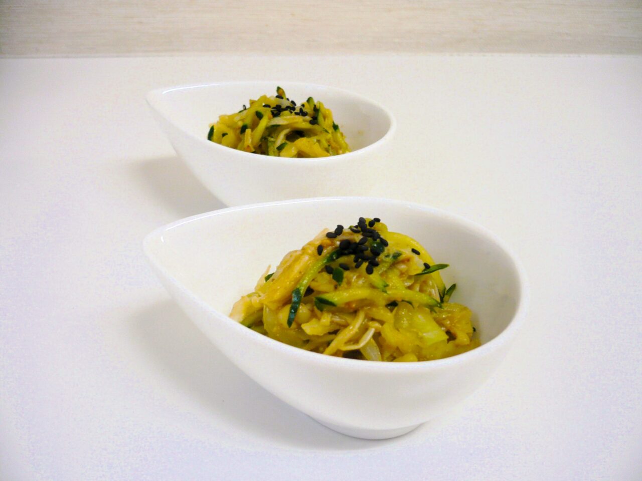 火が通り、薄く色づくまで揚げて油を切っておく。ズッキーニはさっと素揚げする。
