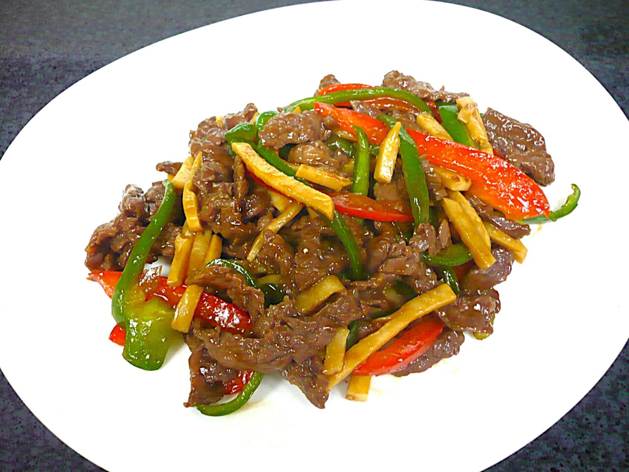 フライパンにごま油を熱し、牛肉を入れて炒め、色が変わったらピーマン、赤パプリカ、たけのこを入れて炒める。