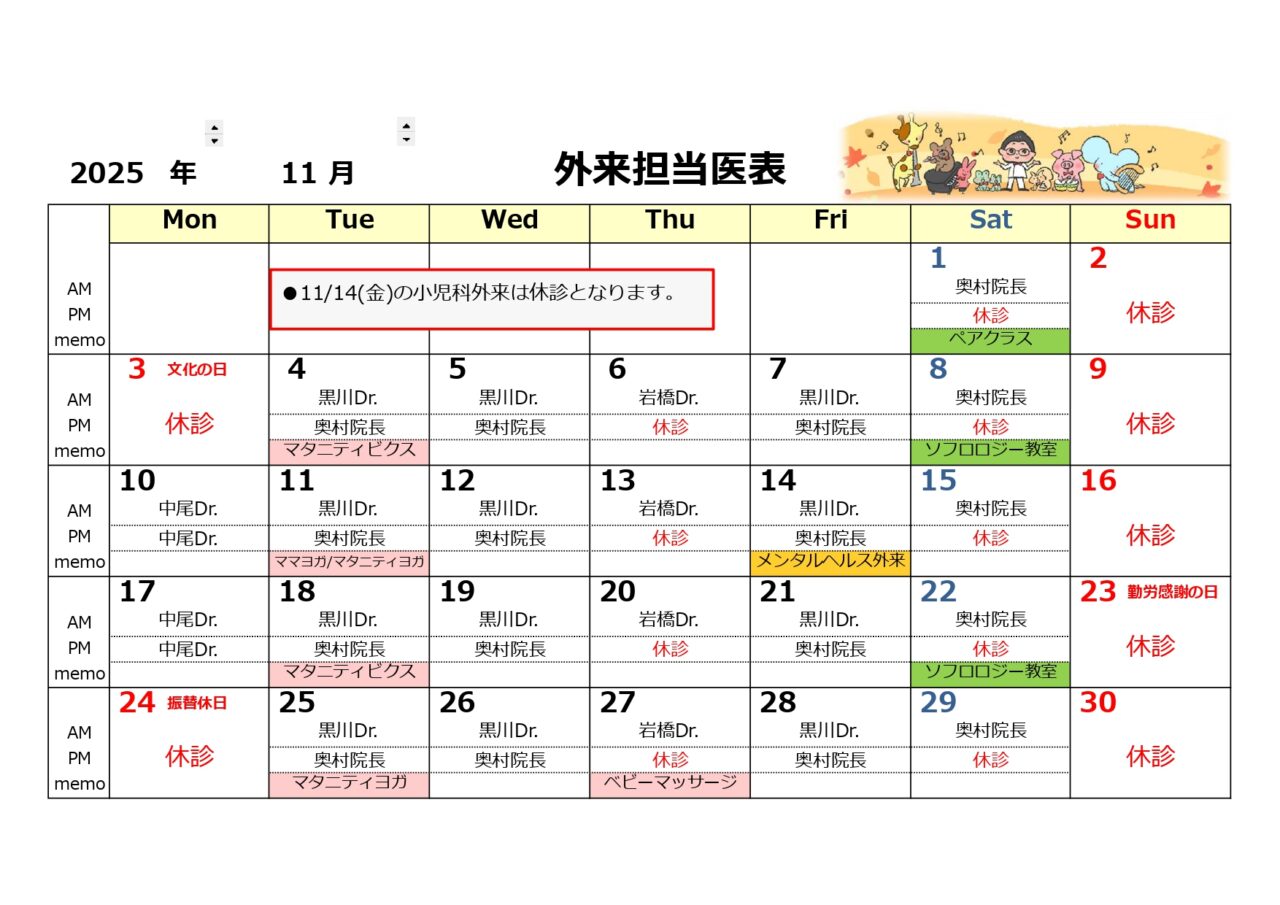 11/14(金)の小児科外来は休診とさせて頂きます。