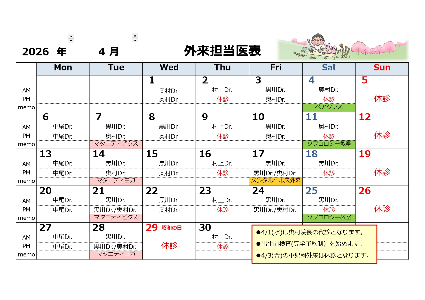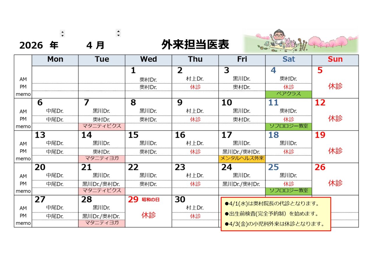 カレンダー掲載以降の代診および休診等のお知らせは随時、新着情報をご確認ください。